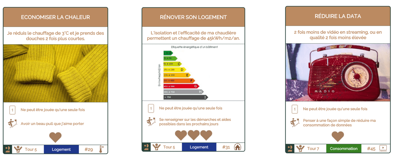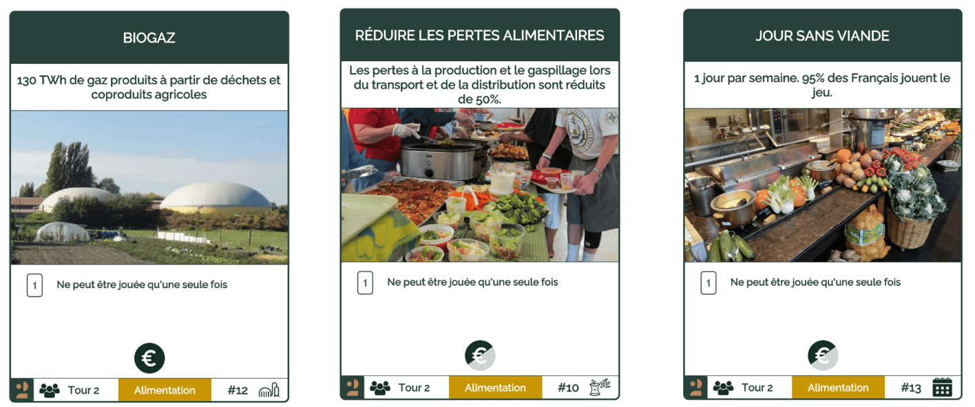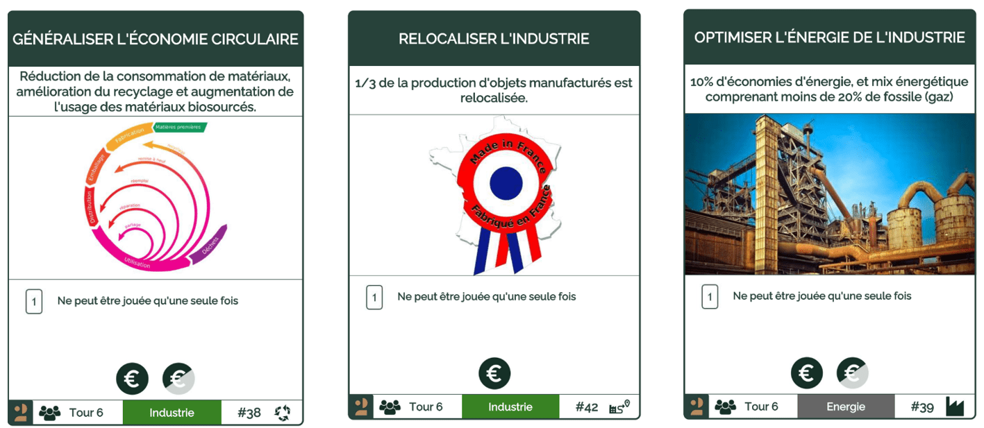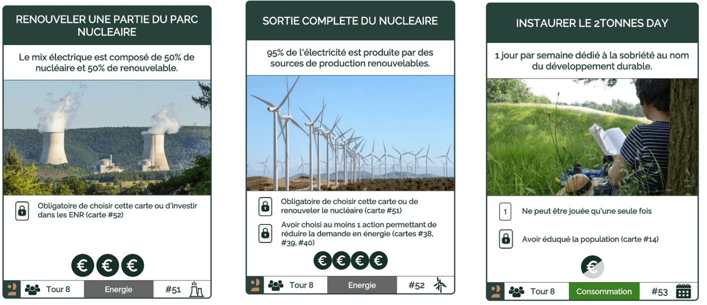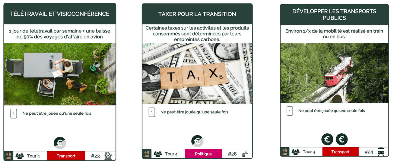 A titre d’exemple, voici quelques cartes actions que les participants peuvent choisir durant ces 4 tours individuels.