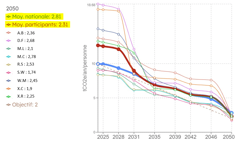 Avant l’atelier, les participants sont invités à réaliser leur bilan carbone individuel. Cet exercice permet à chacun de prendre conscience de son empreinte carbone actuelle. Pour les deux groupes Kervéléoc, le résultat obtenu était plus ou moins éloigné des moyennes annoncées (des pics à 20 Tonnes et plus pour certains, un résultat nettement amélioré pour d’autres roulant en voitures électriques par exemple).