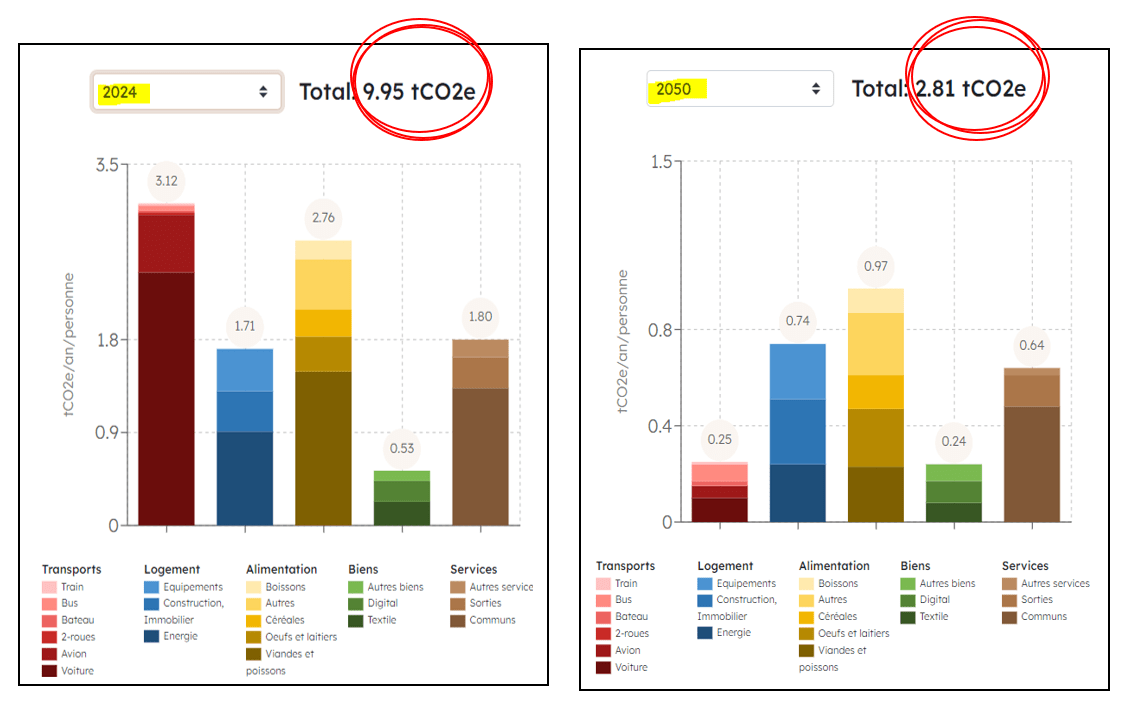 Aujourd’hui, en moyenne, un Français émet 9,5 tCO2e par an. En moins de 30 ans, nous devons donc diviser nos émissions par 5 pour atteindre cet objectif.